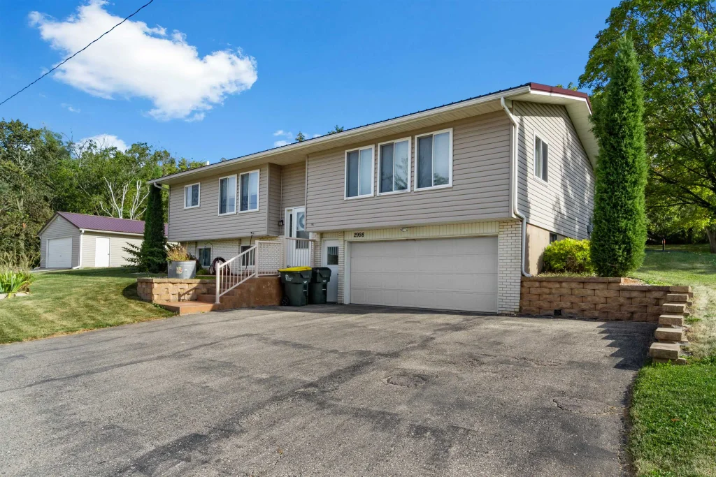 Mature trees and expansive yard surround this stunning 3BR/2.5BA home that backs directly to the Military Ridge Trail in Blue Mounds! Living room has sweeping windows that overlook the front yard. Kitchen has a dining nook with peninsula, ss appliances and abundance of cabinet space. 3 bedrooms on the main level with full bathroom. Walk out to back stamped concrete patio which overlooks the coop, garden beds and trail. Lower level has additional entertainment space with garden views of the front yard and free standing stove. Newly remodeled bathroom and laundry room. Insulated detached 2 car garage has electric and gas lines ran. New furnace/AC in 2021. Quick 20 minute drive to Verona, 10 minutes to Mount Horeb and 5 minutes to Vortex Optics!