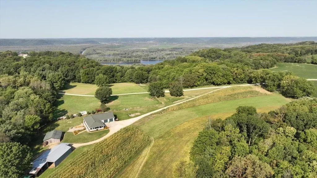 Beautiful 62 Acre farm on a quiet, country, dead-end road above the Mississippi River Valley. This newer home consists of a main level master bedroom with full bath and walkout to back yard deck area. There's a guest bath as well as an open concept kitchen, dining and living area. The lower level contains a kitchen, bedroom, large living area that could be turned into bedrooms as well as a full bathroom, cellar room, utility room and walkout to the back patio area. There's a 3-car attached garage as well as several outbuildings including a pole barn, machine shed, wooded grain bin, and animal shelter. The acreage is about 16 tillable and the rest wooded abundant with wildlife, with 3 permanent deer stands, making this a great hunting property as well.